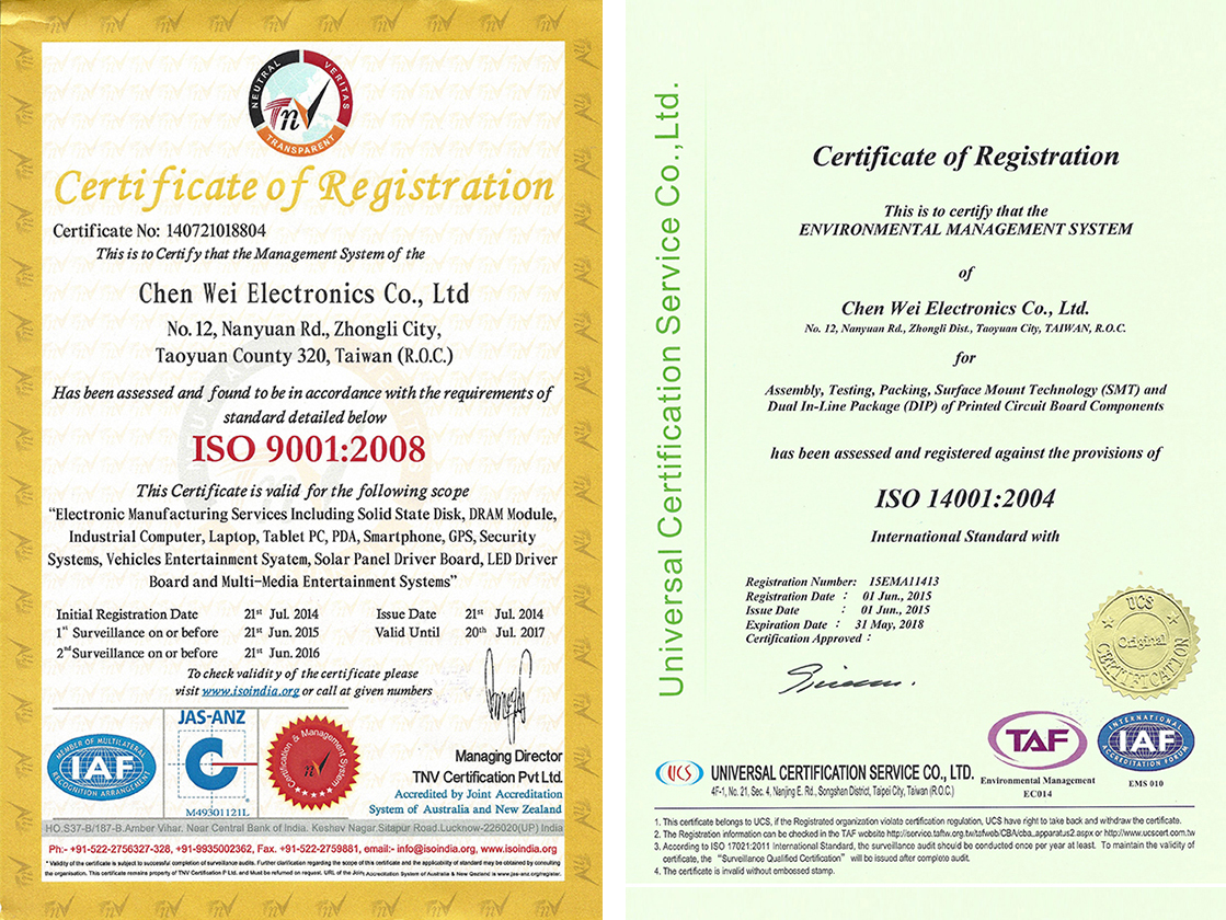Chen Weiis ISO 9001 certified contract assembly company providing printed circuit board assembly, electronic assembly, turn key PCB, module and final product box build services of 3C electronics.
